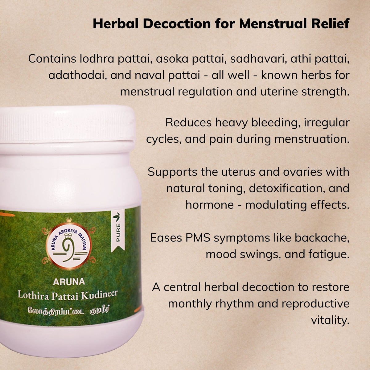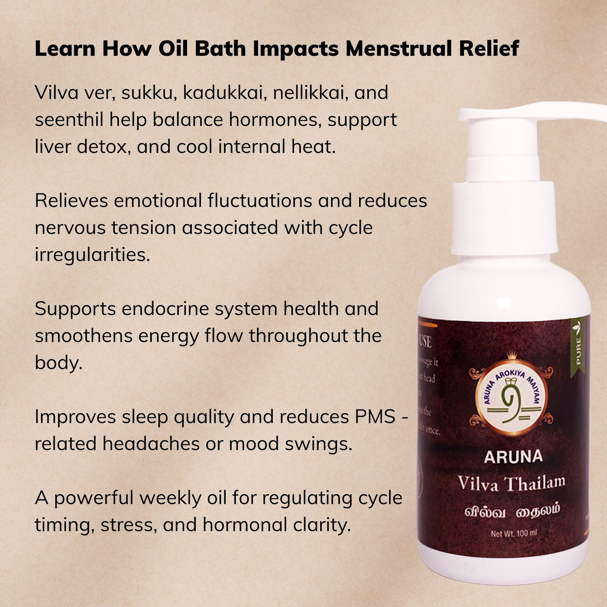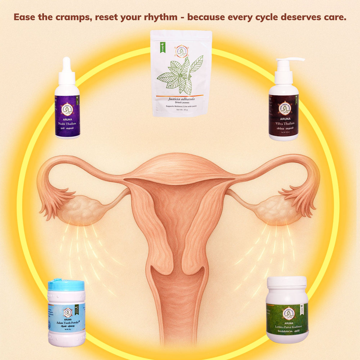 This bundle regulates delayed cycles, reduces clotting, and eases lower abdominal pain with hormone-balancing kudineers, Nabhi oils, and supportive bath rituals.