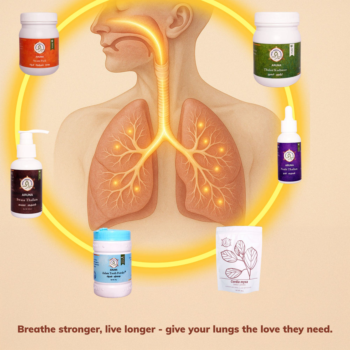 A powerhouse mix of steam blends, lung-toning thailams, and herbal decoctions that clear the chest, reduce wheeze, and restore strong, steady breath.