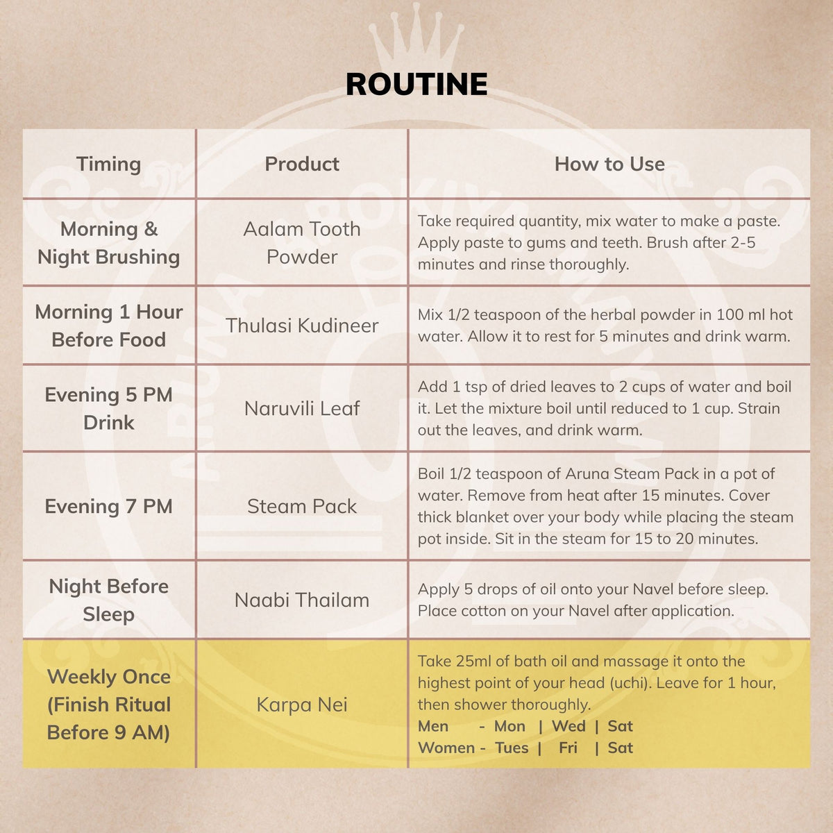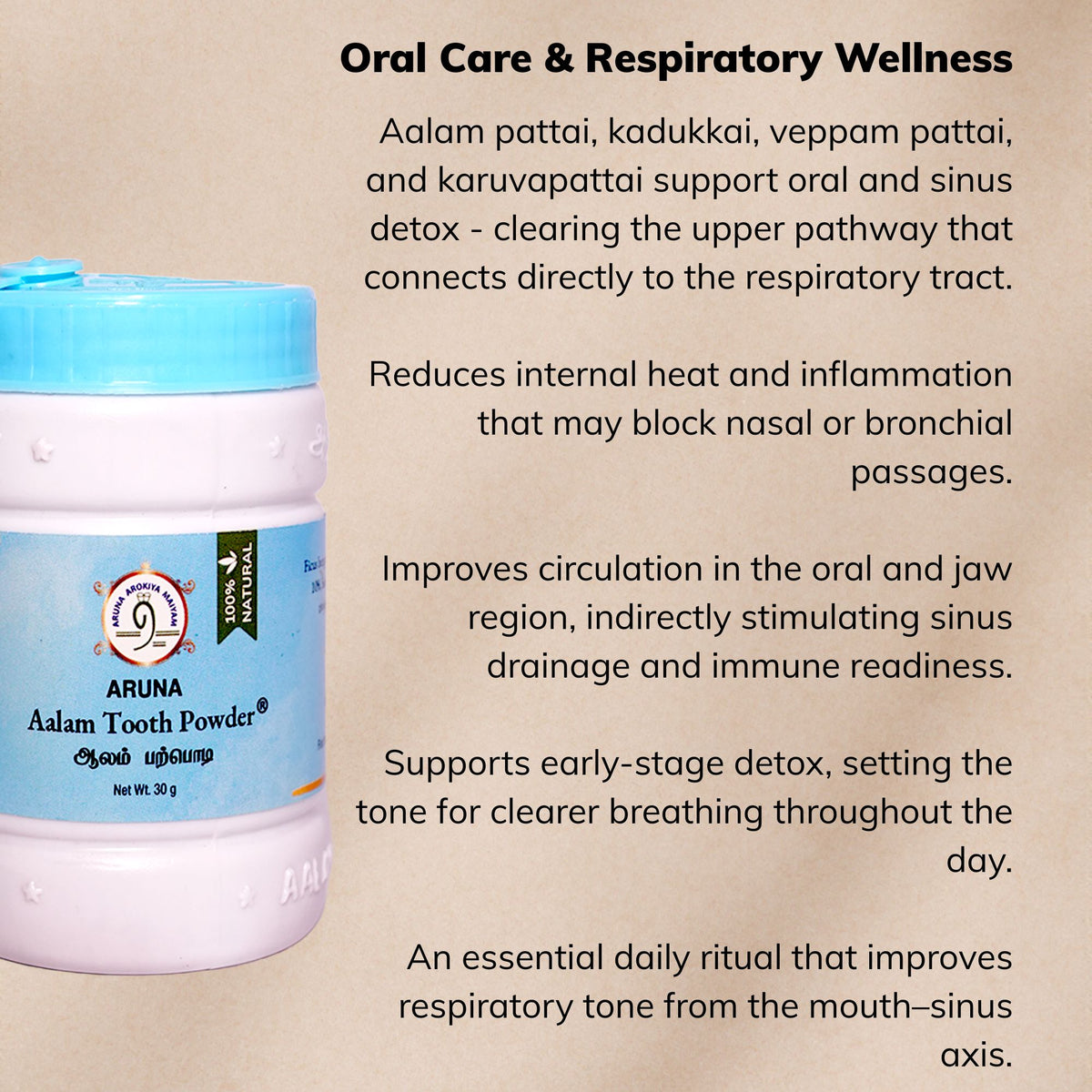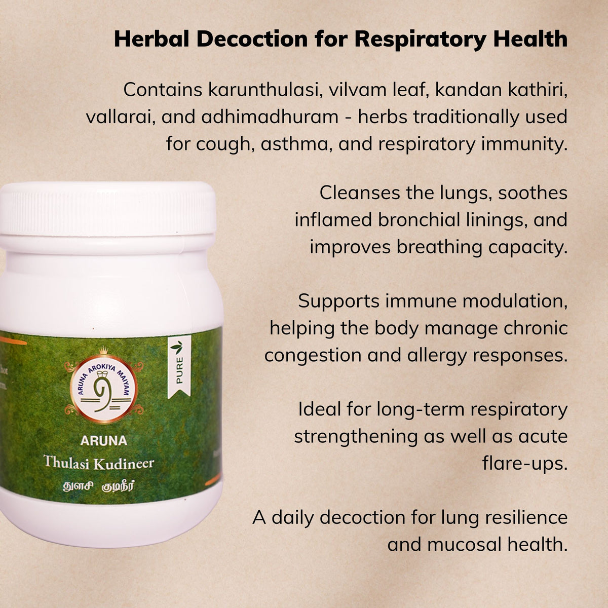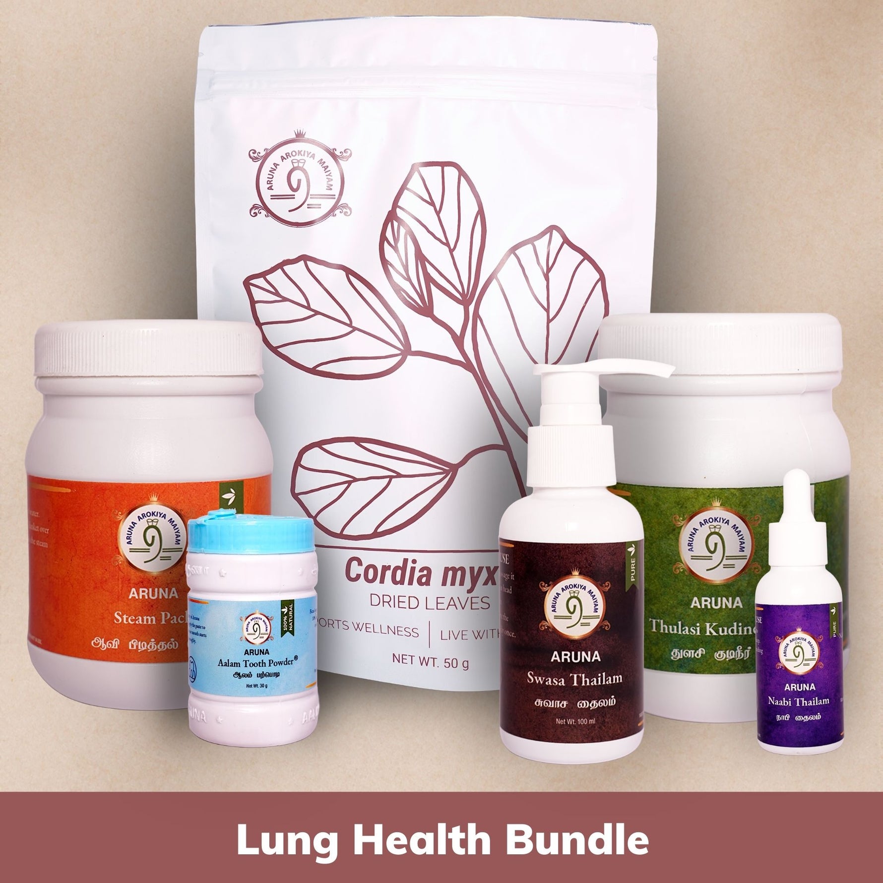 Thulasi Kudineer clears phlegm and boosts immunity, Swasa Thailam and Steam Pack open airways, while Naruvili Leaf and Naabi Thailam cool and stabilize breathing.
