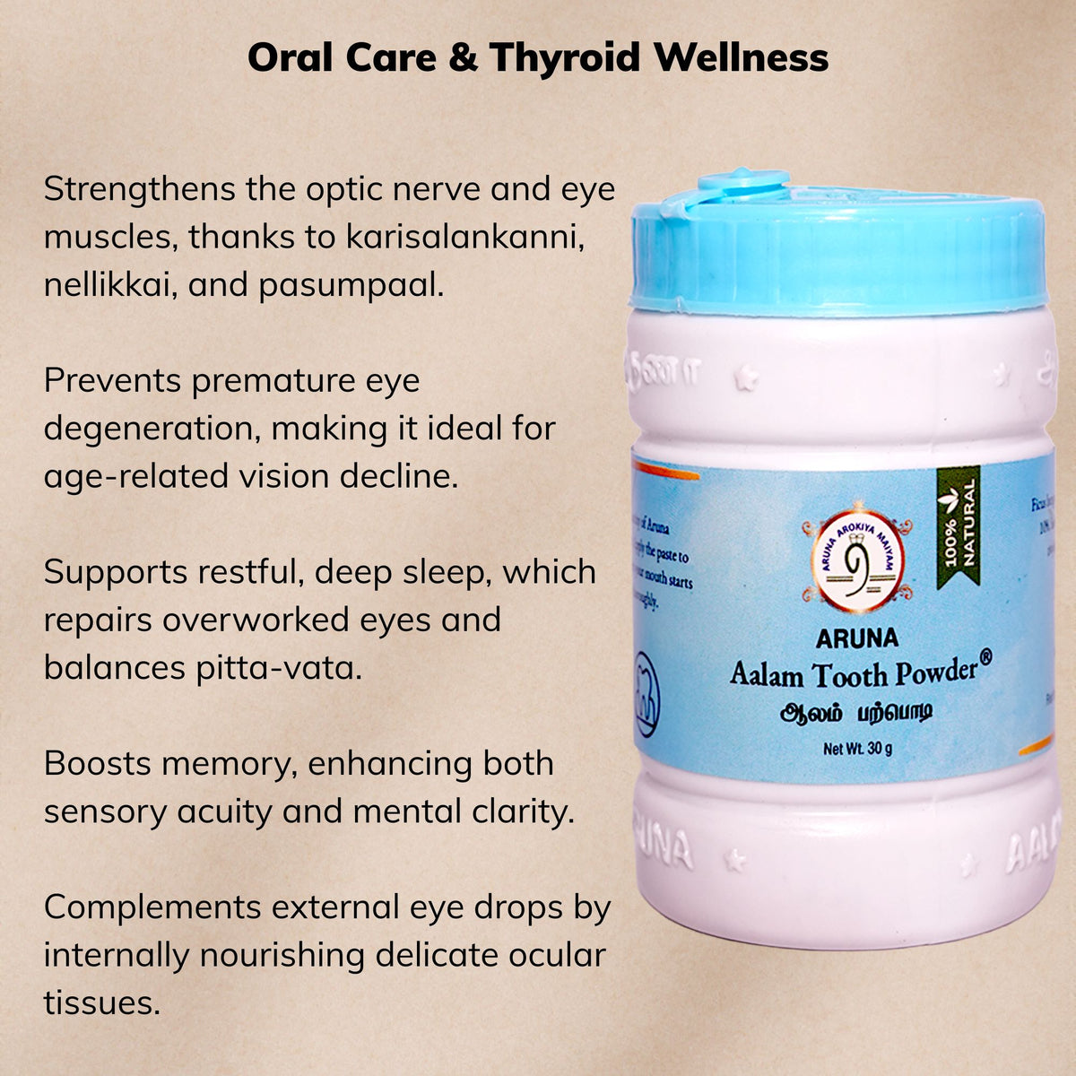 The mouth and throat are closely connected through cranial and lymphatic networks. Aalam Tooth Powder reduces inflammation in the oral region, improves upper-body circulation, and supports detox around the neck and jaw.