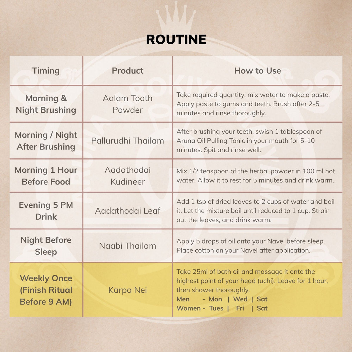Best Days for Oil Bath: Men - Mon, Wed, Sat & Women - Tues, Fri, Sat